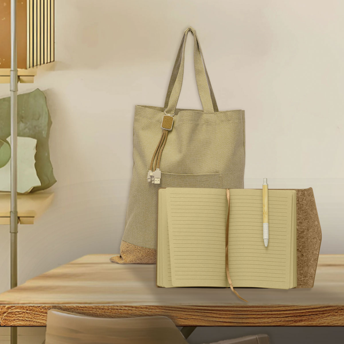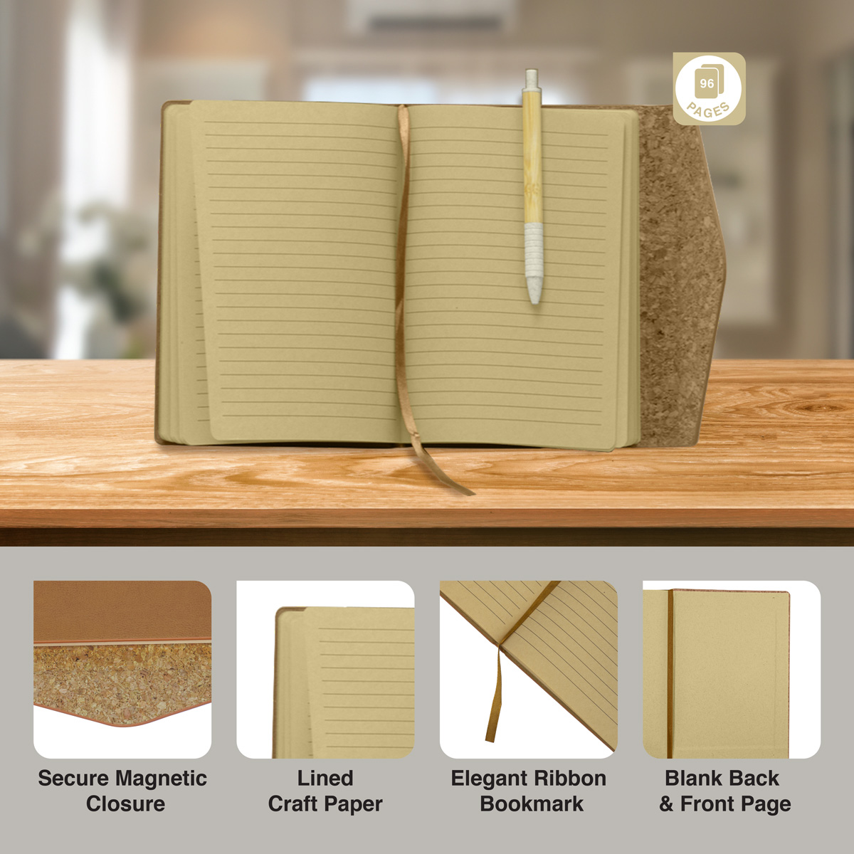 A PU Leather and Cork notebook with 96 pages and a silk placeholder.
