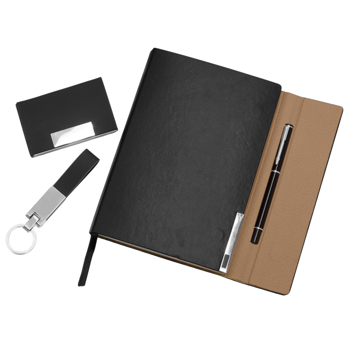 The Olexa Giftset is a sophisticated collection ideal for personal use or gifting. It includes a smooth-writing ballpoint pen, an eco-friendly Thermo PU notebook with recycled paper, a matching card holder, and a sleek keychain. All items come in classic black, exuding elegance and style, perfect for any occasion.